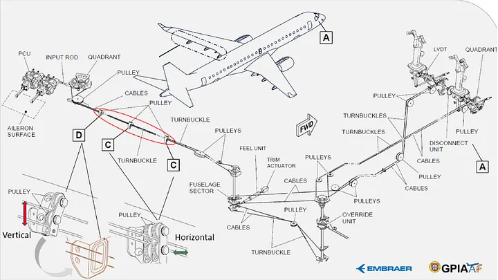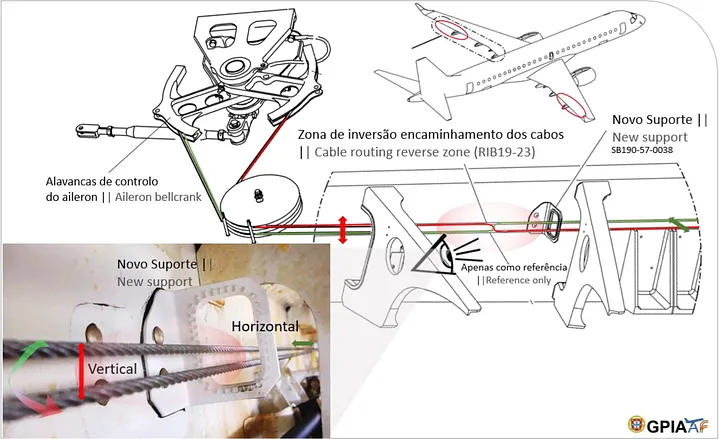 Os ailerons do E190, que controlam o rolamento, são operados por um sistema tradicional de cabos e polias que transmitem os comandos do piloto diretamente aos atuadores hidráulicos. O primeiro dos dois boletins de serviço abordou relatos de atrito excessivo do cabo em torno de uma polia de suporte, orientando que a polia fosse substituída por um suporte sem contato, conforme mostrado acima. O segundo boletim orientava que os cabos de aileron de aço inoxidável fossem substituídos por cabos de aço carbono, mais resistentes ao desgaste.
