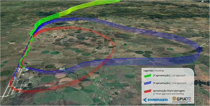 | Mapa 3D das três tentativas de aproximação do voo 1388 (GPIAAF, Google e Embraer) |