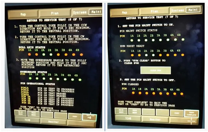 Esses testes continuaram a falhar mesmo após a substituição dos FCMs, e de fato na página sinóptica seis pontos vermelhos indicavam que os CBITs haviam falhado em três dos quatro FCMs (o quarto não estava conectado ao sistema de controle do aileron), mas havia não havia nada no manual que dissesse que o avião não poderia ser despachado naquela condição, desde que o aviso NO DISPATCH desaparecesse. No que lhes dizia respeito, então, o trabalho deles estava concluído.