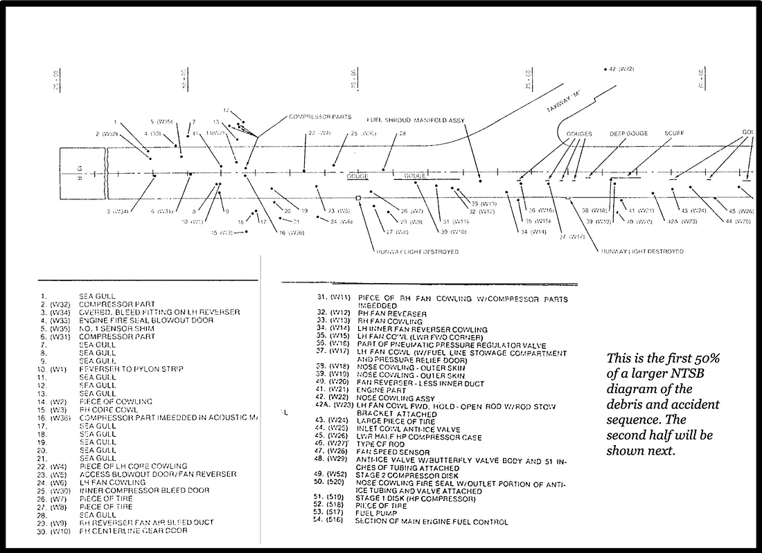 Também é importante notar que uma falha catastrófica de um pneu ocorrendo quase no mesmo momento que um grande acidente com um pássaro é uma coincidência selvagem, se comprovada, mas suspeita, se não. Se o NTSB também tivesse concluído que estes eventos foram uma coincidência, então haveria poucas dúvidas, mas o NTSB não chegou a tal conclusão, com base em evidências que sugeriam que a colisão com pássaros e os danos no motor estavam claramente relacionados.