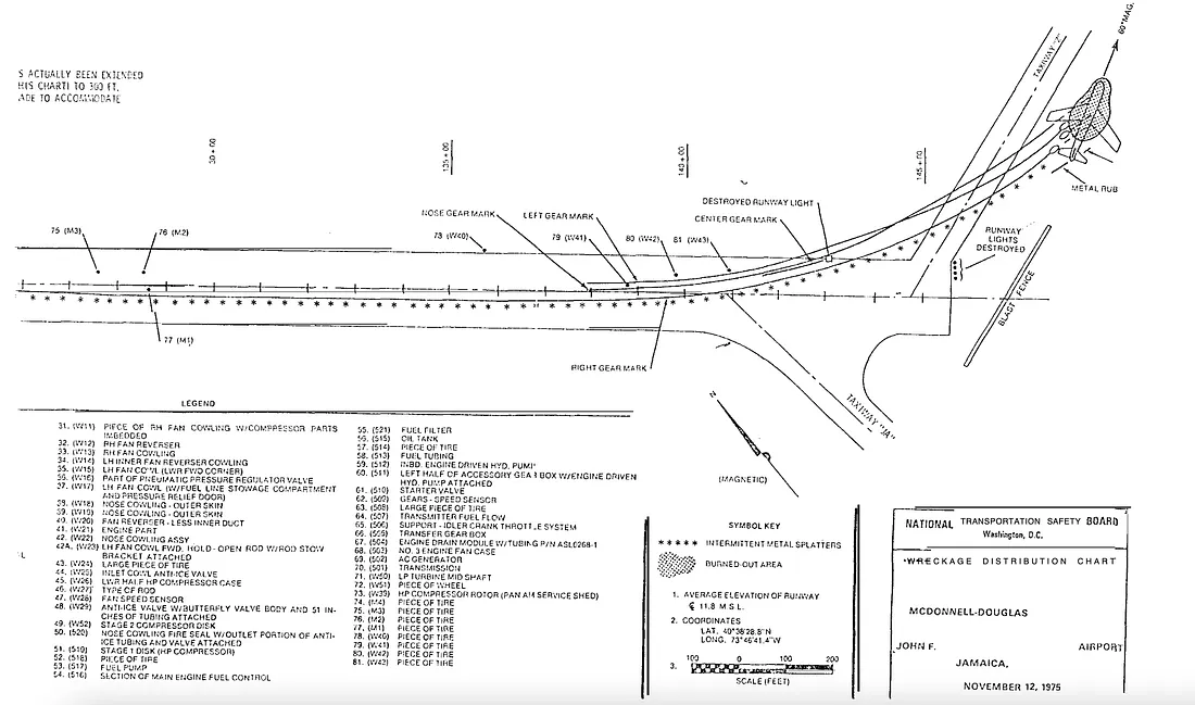 Este fato sublinhou a necessidade de encontrar a causa e tomar medidas corretivas antes que um acidente semelhante pudesse acontecer novamente. A busca por respostas começou na pista 13R do aeroporto JFK, onde os investigadores observaram uma grande variedade de destroços e danos. Na área pouco antes do local de descanso final do avião, riscos e marcas de arranhões mostravam que, no momento em que a aeronave saiu da pista, quatro pneus haviam sido totalmente perdidos e mais quatro estavam vazios.
