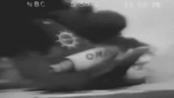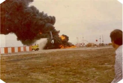 | O sobrevivente do acidente, Charlie Mott, ignorando a regra de que “caras expertos não olham para explosões”, olha de volta para o avião em chamas (Charlie Mott) |