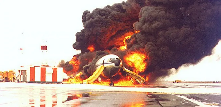 Quando a asa direita atingiu o solo, os restos do motor nº 3 perfuraram a asa e romperam os tanques de combustível internos, causando um enorme derramamento de combustível que acelerou bastante o incêndio. Em segundos, chamas e fumaça cercaram a área traseira da fuselagem, de onde começaram a entrar na cabine. Mas entre os passageiros não houve pânico – a grande maioria eram comissários de bordo que passaram a carreira treinando exatamente para esse cenário.