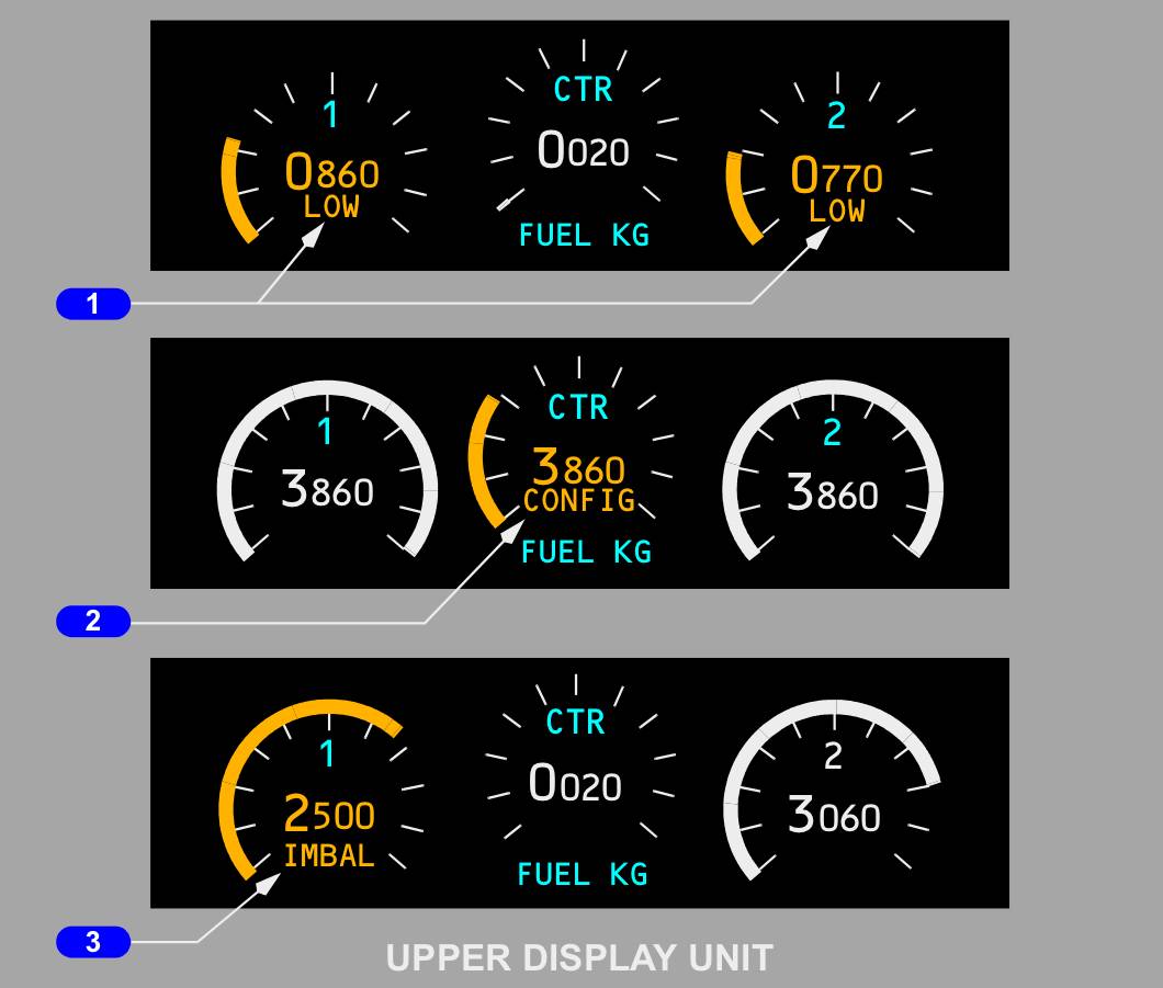 | Diagrama de indicação de combustível do Boeing 737 (Imagem: Boeing 737 FCOM) |