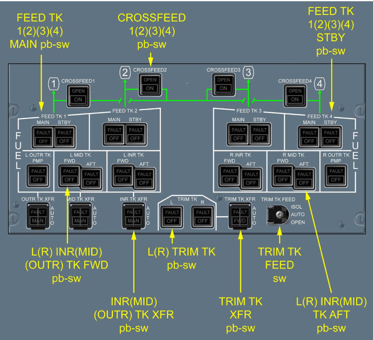 Em operações normais, o tanque esquerdo fornece combustível para o motor esquerdo e o tanque direito fornece combustível para o motor direito. Em caso de falha do motor, o motor restante pode ser abastecido com combustível do outro lado usando uma válvula de alimentação cruzada. Por exemplo, se o motor direito falhar, o combustível do tanque esquerdo poderá ser direcionado para o motor direito quando a válvula de alimentação cruzada for aberta.
