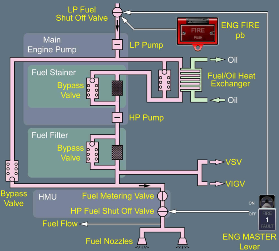 Depois que o combustível é bombeado pelas bombas do tanque, ele é encaminhado para a válvula de combustível de baixa pressão (LP), às vezes chamada de válvula spar. A partir daí, o combustível passa pelas bombas acionadas pelo motor. Algumas aeronaves possuem uma bomba de baixa pressão e uma bomba de alta pressão, acionadas pelo compressor de alta pressão do motor.