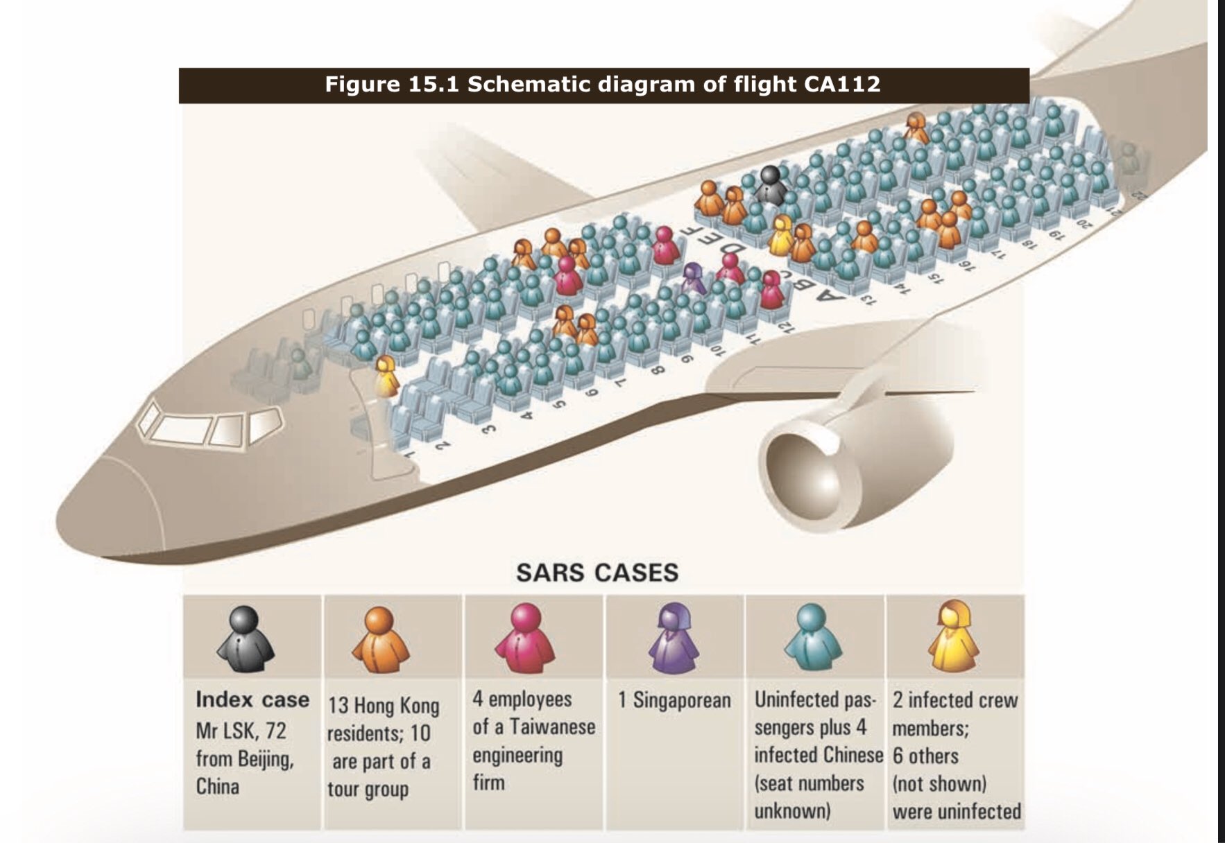 Outros quatro da China que não foram entrevistados diretamente foram relatados à OMS. O tempo médio para o início dos sintomas foi de quatro dias. Nenhuma dessas 22 pessoas teve qualquer outra exposição à SARS além do voo 112.