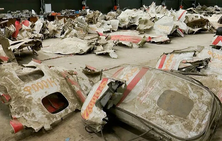 Pedaços do Tu-154 foram recuperados e colocados no pátio em Smolensk Norte. (Rede de Segurança da Aviação)