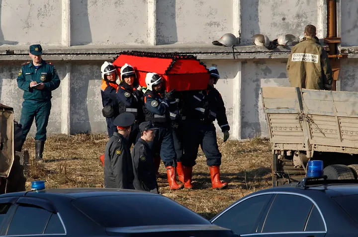 Bombeiros perto da cauda durante o processo de limpeza dos destroços (Moscow Times)