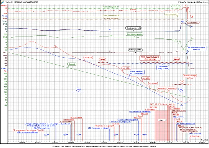 Os problemas de fato começaram quando o TAWS foi ativado devido à ausência do Aeroporto Norte de Smolensk em seu banco de dados. Enquanto os investigadores do MAK se recusaram a conectar explicitamente esse evento com o navegador pressionando o botão de “pressão padrão” no altímetro barométrico do capitão, os investigadores poloneses foram muito menos reticentes, escrevendo que isso certamente foi feito para silenciar o alarme. Era uma maneira perigosamente incorreta de fazer isso, mas uma que os pilotos do 36º Regimento aparentemente aprenderam informalmente.