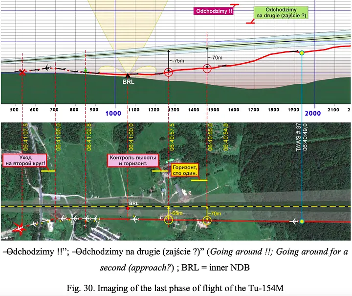 Os pilotos pareciam estar cientes da presença da ravina, pois os investigadores poloneses notaram que às 10h40 e 12 segundos o copiloto disse: “Há um mergulho Arek”, ao qual o capitão Protasiuk respondeu: “Eu sei, está chegando em breve”. Esta declaração estava ausente da versão do MAK da transcrição do gravador de voz da cabine. No entanto, o navegador nunca declarou que estava anunciando a altura do rádio e não a altura acima do campo, então era provável que os pilotos nunca tivessem percebido que estavam descendo para o "mergulho" que o Major Grzywna havia mencionado.