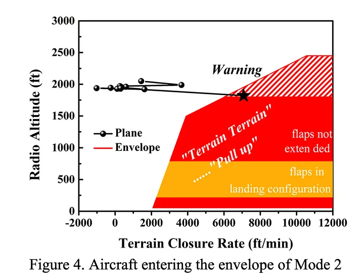 Neste ponto da aproximação, o avião ainda estava acima da trajetória de planeio, mas descendo muito abruptamente, devido ao uso incorreto do volante “DESCENT — CLIMB” pelo capitão. Conforme a aeronave passava sobre a ravina, ela começou a descer abaixo da trajetória de planeio, mas o terreno abaixo do avião estava simultaneamente caindo, fazendo com que a leitura do rádio altímetro permanecesse em torno de 100 metros por cerca de dez segundos críticos, bem quando o TAWS começou a emitir avisos de terreno novamente.