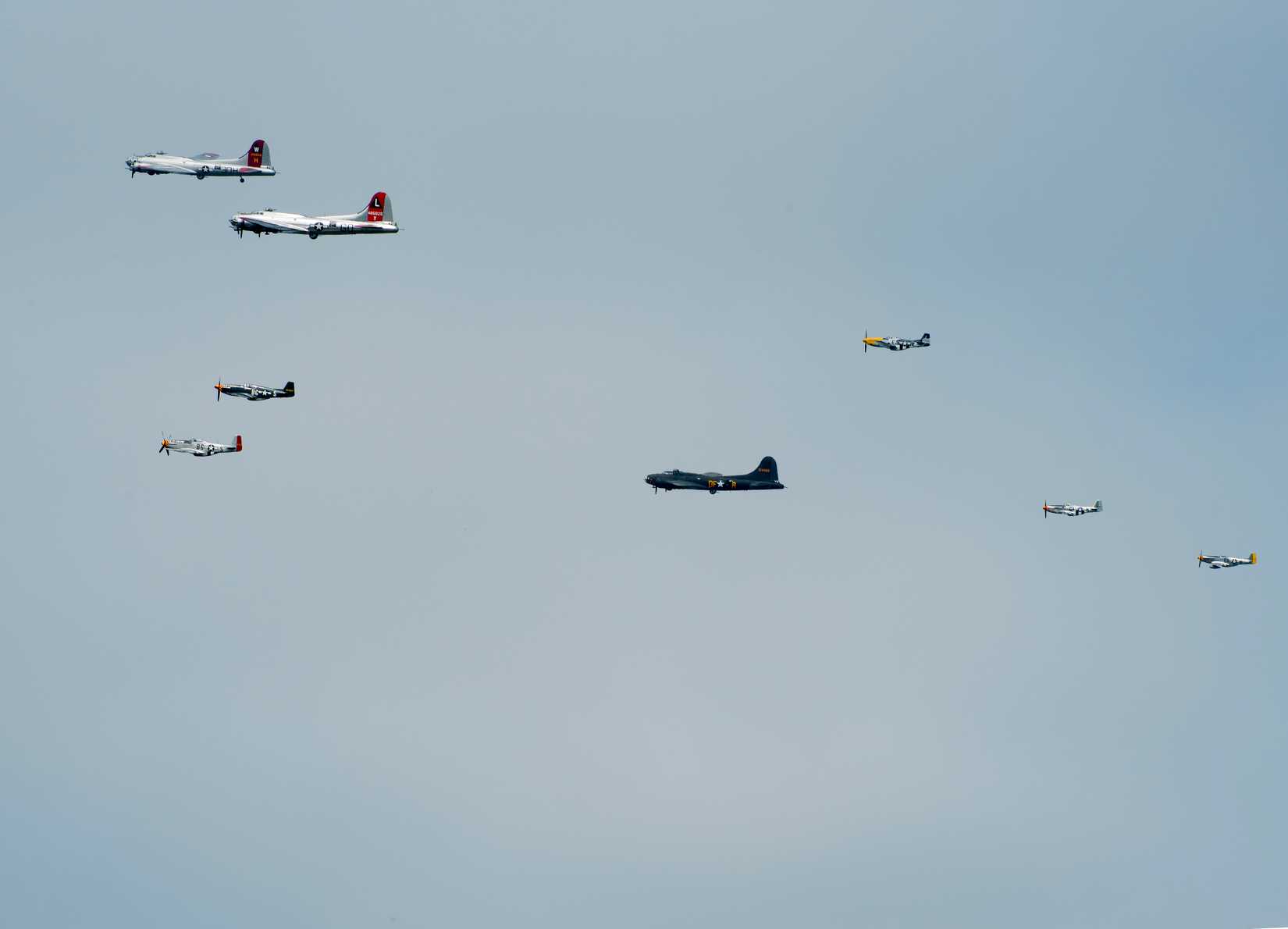 Esses cinco modelos restaurados do B-17G foram pintados e modificados para se assemelharem às versões anteriores do B-17F, completos com a icônica arte do nariz “Memphis Belle”. Cenas aéreas mostram esses bombardeiros voando em formação sobre o interior da Inglaterra, recriando a missão final do Belle.