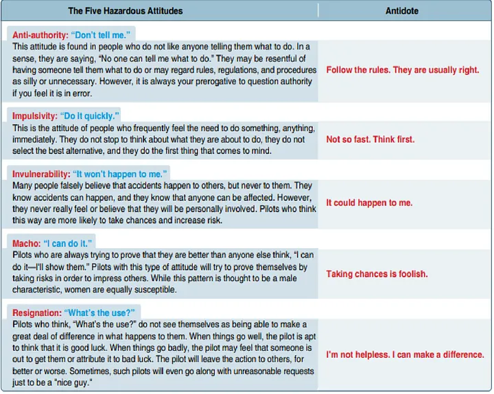 Uma excelente maneira de olhar para os eventos que levaram ao acidente é através das lentes das chamadas “cinco atitudes perigosas” da Administração Federal de Aviação, consistindo em antiautoridade, impulsividade, invulnerabilidade, machismo e resignação. O gráfico da FAA acima fornece definições mais detalhadas dessas atitudes.