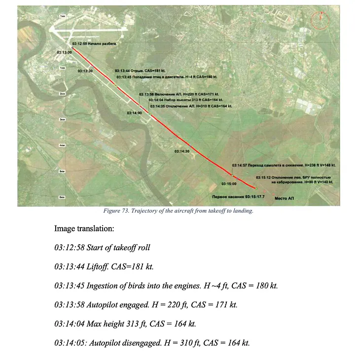 Então, uma vez em movimento, os pilotos viram pássaros novamente, levando a algumas declarações profanas, mas a possibilidade de que não fosse seguro continuar a decolagem aparentemente nunca lhes ocorreu. Abortar uma decolagem porque havia pássaros por perto não era algo que eles eram treinados ou que não se esperava que fizessem e, além disso, se toda tripulação que visse pássaros rejeitasse a decolagem, dificilmente algum avião partiria de Zhukovsky!se todos os tripulantes que vissem pássaros rejeitassem a decolagem, dificilmente algum avião partiria de Zhukovsky!