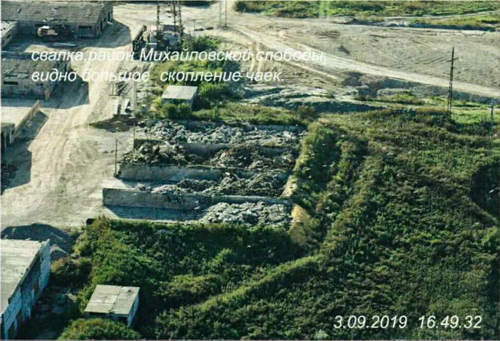 Pequenos pontos brancos visíveis em uma foto aérea revelam a presença de gaivotas no lixão do bairro Mikhailovskaya Sloboda (MAK)