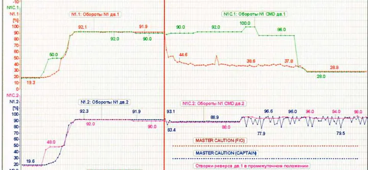 Um trecho da gravação de dados de voo mostra o comportamento dos motores ao longo do tempo. A linha laranja representa o motor esquerdo N1 real; verde representa o motor esquerdo comandado N1; azul representa o motor direito N1 real; e rosa representa o motor direito comandado N1. A linha laranja vertical representa o momento do impacto com o pássaro (MAK)