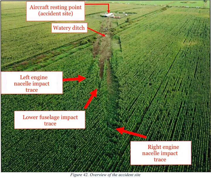 Em uma descida constante, chafurdando com o nariz empinado, o avião se segurava precariamente, pendurado no ponteiro digital do todo-poderoso sistema de proteção alfa. A cabine se encheu de um estrondo cacofônico, enquanto o alarme de desconexão do piloto automático continuava a soar em meio a estrondos e rugidos do motor direito em alta velocidade, pontuado a cada poucos segundos pelo som do sistema de alerta de proximidade do solo gritando "DON’T SINK!" e "TERRAIN AHEAD! PULL UP!" À frente, estendiam-se milharais vazios, entrecortados por estradas e valas — aquela seria a zona de impacto, e eles tinham apenas alguns segundos para se preparar.