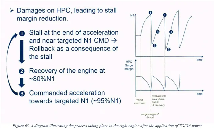 À medida que o motor acelerava em direção a TO/GA, ou 96% N1, o dano às pás do ventilador interrompeu o fluxo de ar para a seção do compressor, fazendo com que o ar do compressor de alta pressão explodisse para a frente no compressor de baixa pressão. Essa reversão momentânea do fluxo de ar é conhecida como surto ou estol do compressor. Nesse caso, cada pico fazia com que o valor de N1 do motor direito caísse para 78%, momento em que começava a subir de volta ao valor comandado, fazendo com que a pressão no compressor de alta pressão aumentasse até que o motor voltasse a subir, repetidamente, a cada dois segundos, como um contra-explosão contínuo. Isso fazia com que o empuxo total disponível diminuísse ainda mais.