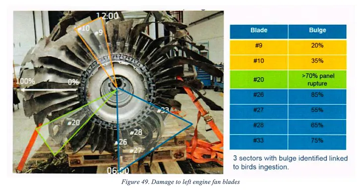 O motor esquerdo certamente atendeu a esse requisito. Quanto ao motor direito, as regras de certificação exigiam que um motor que ingeriu uma ave média continuasse a operar com uma perda de empuxo não superior a 25%. O gravador de dados de voo mostrou que, após o impacto com o pássaro, a potência do motor direito N1 caiu de 91% para 88% devido a uma falha no sensor, o que correspondeu a uma perda de 10% de empuxo. Danos mecânicos nas pás do ventilador reduziram a potência em mais 10%, totalizando 20%, o que estava dentro dos requisitos de certificação.