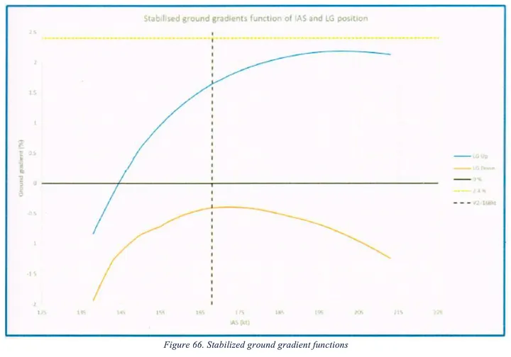 Este gráfico mostra as inclinações de subida alcançáveis com empuxo do motor constante e trem de pouso estendido [laranja] vs. retraído [azul]. O eixo X representa a velocidade do ar e o eixo Y representa a inclinação de subida, onde a linha preta representa uma inclinação de subida de 0% (MAK)