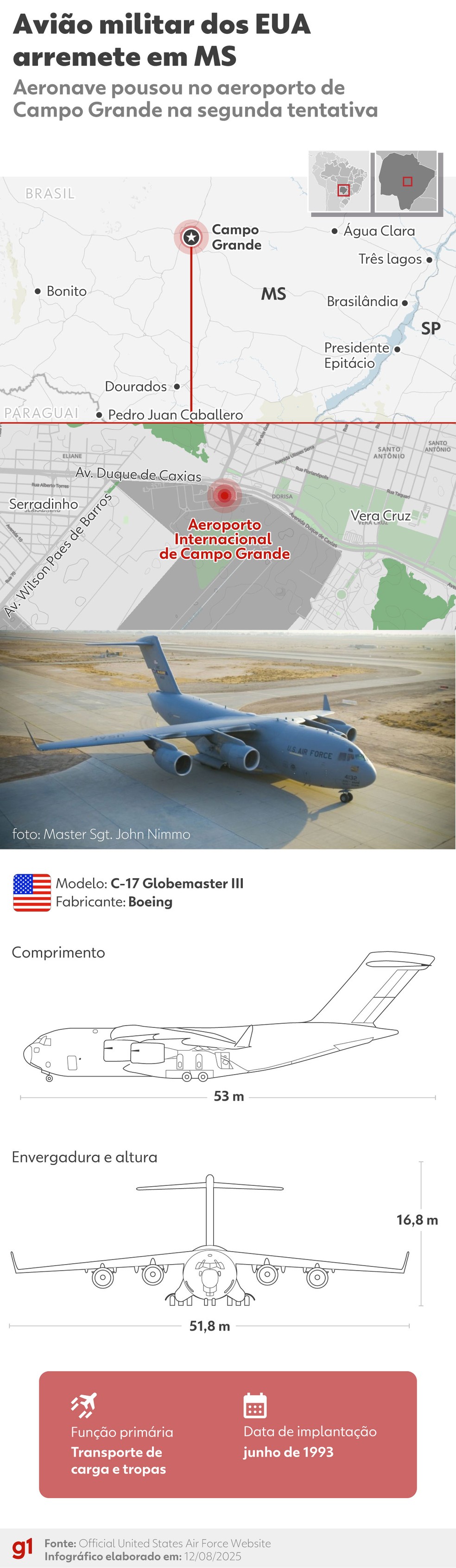 Aeronave, que pode atingir até 833 km/h, pousou no aeroporto de Campo Grande na segunda tentativa. Além de poder transportar veículo blindado de combate terrestre, que chega a 69 toneladas, caminhões, reboques e também 102 paraquedistas.