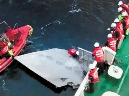 Uma grande parte do voo 991 da Asiana Airlines permanece na costa após ser recuperada no Mar da China Oriental (Coreia ARAIB) |