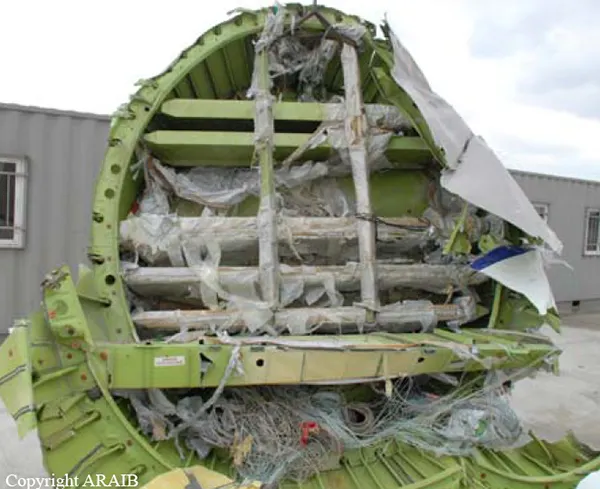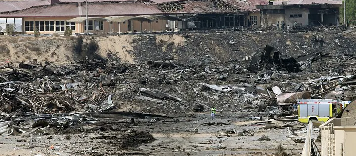 | Um vasto rastro de detritos escurecidos marca o rastro de solo pós-impacto do 747 (GCAA) |