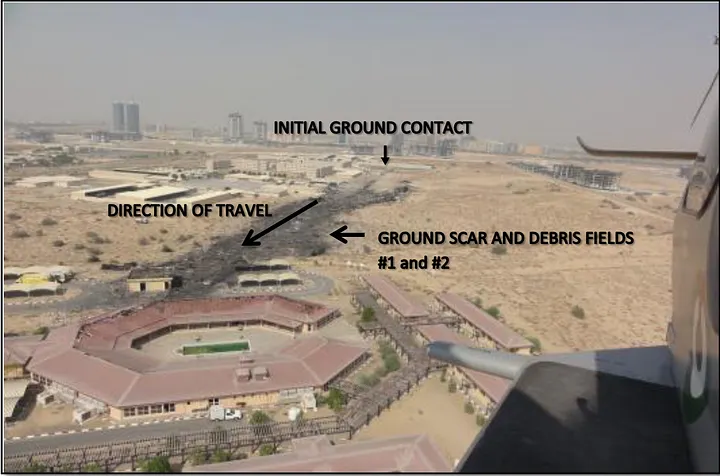 O voo 006 mergulha em direção ao Oásis de Silício de Dubai. Nad Al Sheba é a base militar onde ocorreu o impacto (GCAA) |