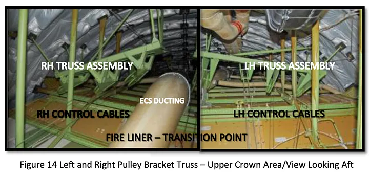 | Uma vista dos cabos de controle de voo em relação à linha de proteção contra incêndios que circunda o porão de carga do convés principal. Imagine chamas irrompendo de baixo e afrouxando os cabos (GCAA) |