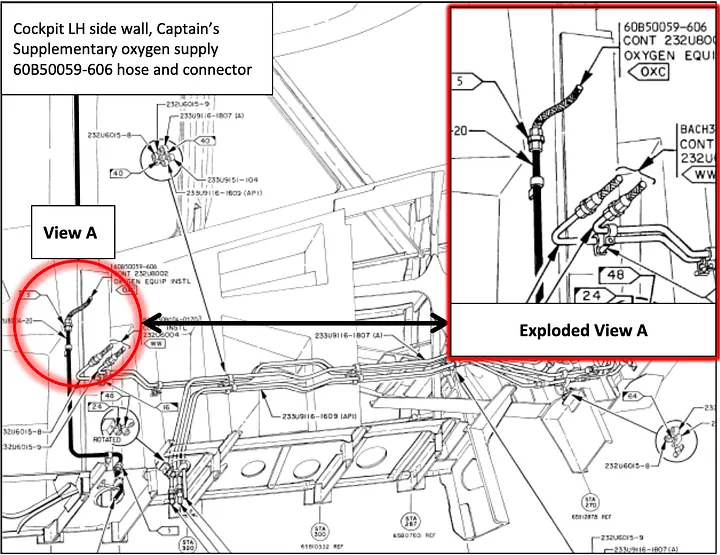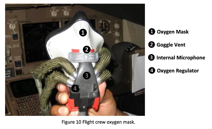 Ao contrário das máscaras de oxigênio para passageiros, as máscaras da tripulação podem fornecer oxigênio por duas horas ou mais, então o problema de Lampe não era estar ficando sem oxigênio. Em vez disso, o fogo havia começado a atingir um conector de mangueira flexível que fazia parte do sistema de distribuição do suprimento comum de oxigênio da tripulação para a máscara lateral do capitão, causando sua falha. Sem oxigênio fluindo de sua máscara, a única opção de Lampe foi recuperar a máscara reserva da tripulação e o cilindro de oxigênio de seu armário atrás do assento auxiliar na parte traseira da cabine.