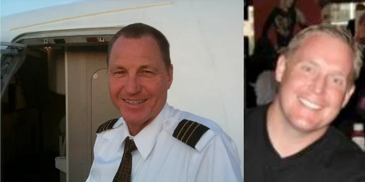 | Capitão Doug Lampe, à esquerda, e Primeiro Oficial Matthew Bell, à direita. (Tim Byrd e Matthew Bell) |