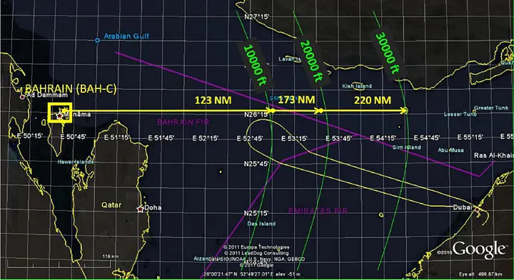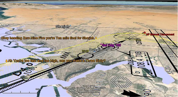| Voo 6 sobrevoa o Aeroporto Internacional de Dubai (GCAA) |