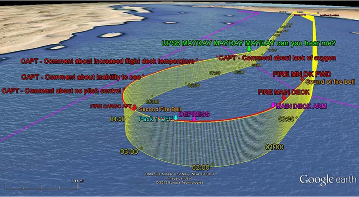 Em 3 de setembro de 2010, um cargueiro Boeing 747 da UPS Airlines declarou emergência a 32.000 pés acima do Golfo Pérsico, relatando o início do pior pesadelo de qualquer piloto de carga: um incêndio no convés principal. À medida que a tripulação dirigia a aeronave de volta para Dubai, a situação se agravou progressivamente, com a fumaça enchendo a cabine e os controles de voo começando a falhar; então, o capitão perdeu seu suprimento de oxigênio e desmaiou, deixando o primeiro oficial sozinho aos comandos de um leviatã aleijado.