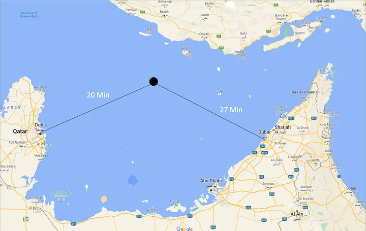 | Esta imagem do meu podcast, Controlled Pod Into Terrain, ilustra como o avião estava quase equidistante de Doha e Dubai, embora levasse mais tempo para chegar a esta última (CPIT, mapa do Google) |