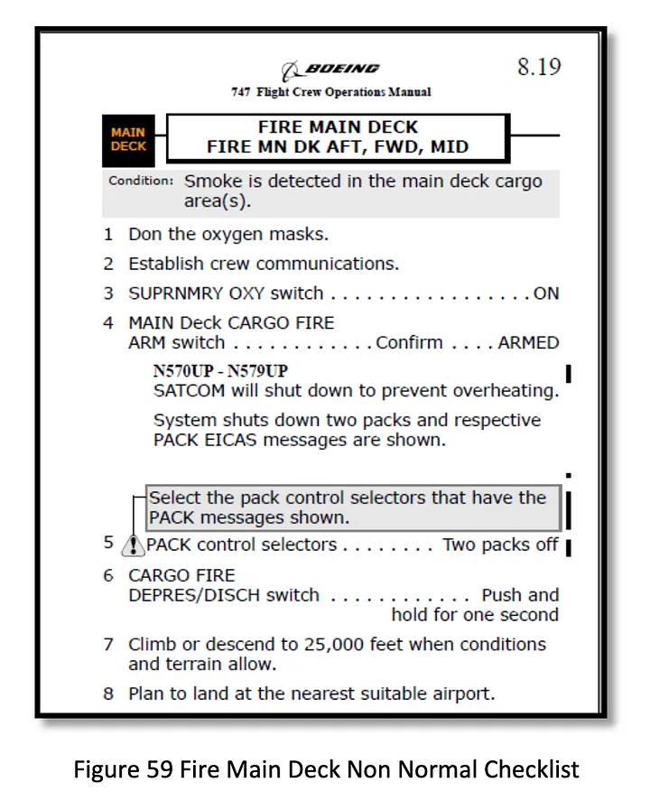 Além disso, o processo de extinção de um incêndio por despressurização era potencialmente confuso para as tripulações de voo. A lista de verificação para um incêndio no convés principal exigia que a tripulação subisse ou descesse a 25.000 pés "quando as condições e o terreno permitissem", sem especificar quais "condições" deveriam ser consideradas, e na etapa seguinte exigia um pouso no aeroporto adequado mais próximo, criando uma aparente contradição. Se as tripulações precisam pousar o mais rápido possível em caso de incêndio — e devem! — então como e quando devem subir a 25.000 pés para despressurizar o porão de carga? No geral, parece mais seguro não se preocupar.