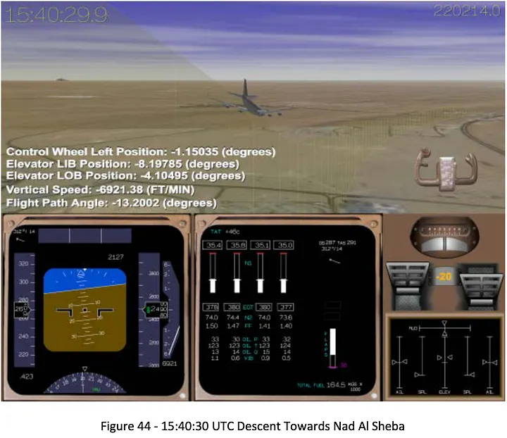 Incapaz de ver seus instrumentos ou sintonizar novamente seus rádios, ele tentou alinhar-se para pousar em Dubai, mas não conseguiu. Como os sistemas falharam a torto e a direito, o 747 sobrevoou o aeroporto, fez uma curva e caiu no deserto dos Emirados, ceifando a vida de ambos os pilotos, apesar das tentativas heroicas do primeiro oficial Matthew Bell de salvar a aeronave atingida.
