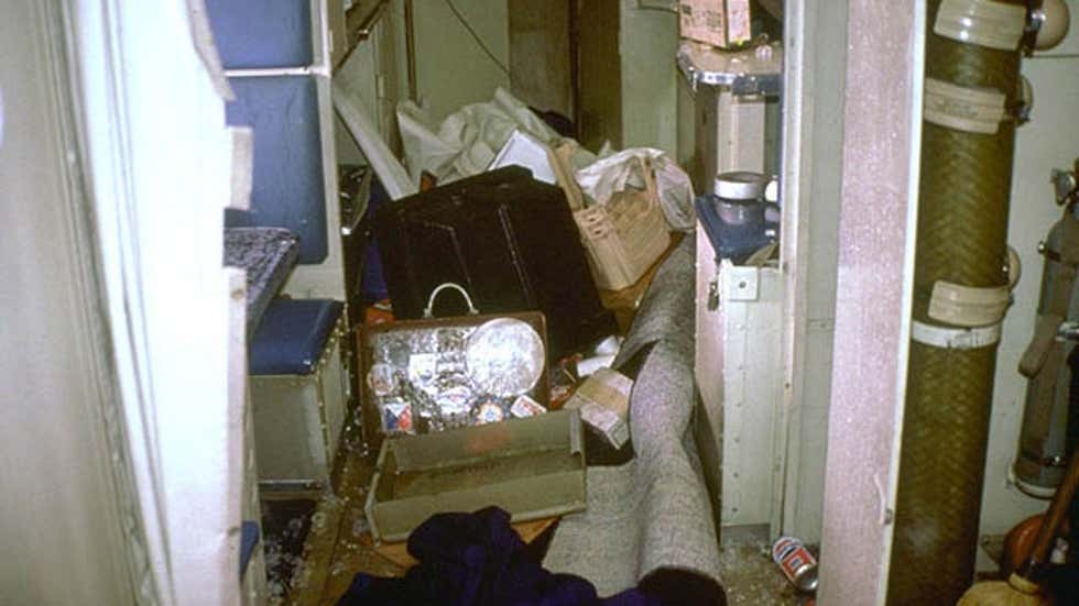 Parecia uma categoria 5 no interior do avião quando a tripulação finalmente chegou ao centro calmo de Hugo. Tudo o que estava remotamente solto foi jogado pela cabana, caindo em pilhas na altura dos joelhos até a cintura. Um bote salva-vidas de 200 libras foi lançado como um míssil, fazendo um amassado de 2,5 centímetros em um corrimão de aço.