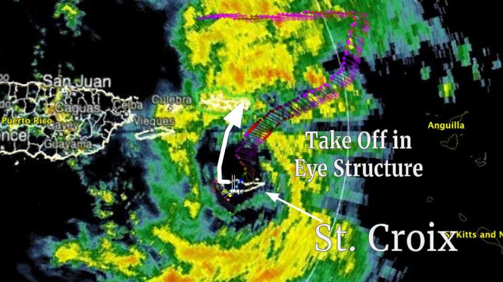 A primeira observação dos Hurricane Hunters do centro de Irene neste voo, chamada de mensagem de dados de vórtice, foi apenas 20 milhas a noroeste de St. Croix, enquanto Irene se afastava da ilha.