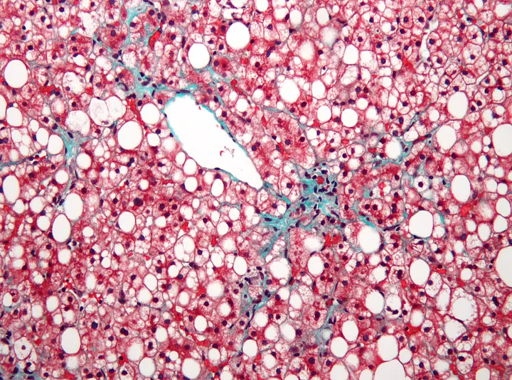 Um exemplar de seção transversal de um fígado humano sofrendo de doença hepática gordurosa não alcoólica. As manchas brancas são intrusões de gordura (Usuário do Wikimedia Nephron)