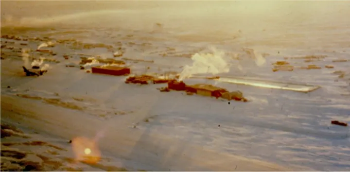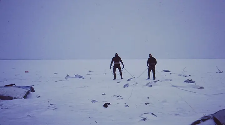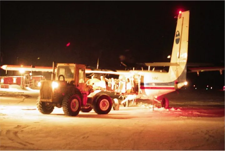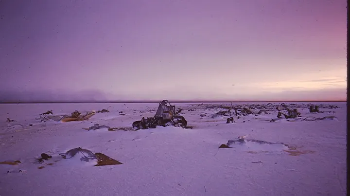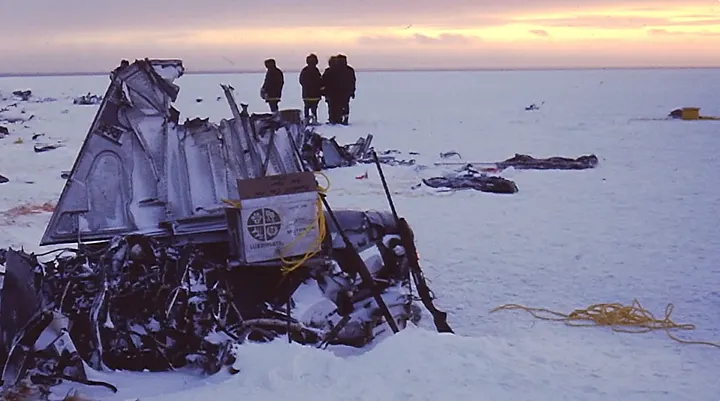 Enquanto isso, no gelo a cerca de 3 quilômetros do aeroporto, o engenheiro de voo Weyman e o primeiro oficial Hatton esperavam desesperadamente, cercados por pedaços da carga do avião e manchas de destroços em chamas. A temperatura era de -24˚C (-11˚F) e o vento soprava incessantemente, lançando cortinas de cristais de gelo pela extensão sem características. Weyman sabia que eles não sobreviveriam muito tempo sem abrigo, mas não havia onde se esconder.