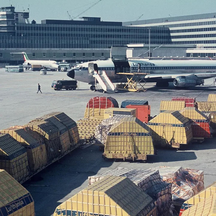 | Paletes de carga e contêineres prontos para carregamento em um Lufthansa Cargo B707. Observe como a parte superior de cada palete fica mais estreita para caber na fuselagem cilíndrica (Lufthansa Cargo) |