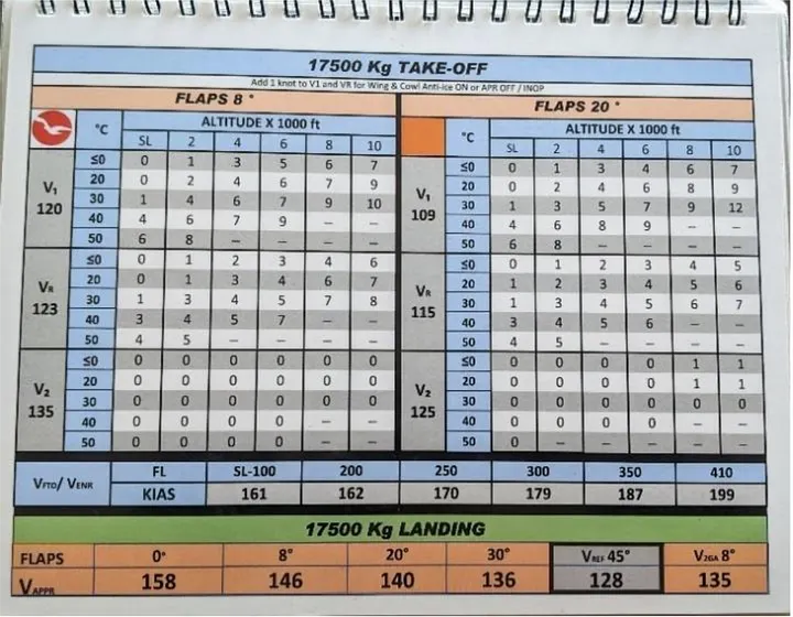 Usando o cartão mencionado, o Primeiro Oficial Katuwal calculou que V1 seria de 114 nós; VR, 118 nós; e V2, 126 nós. Esses eram os valores corretos para a temperatura e altitude atuais, considerando o cartão de velocidade V de 18.500 kg. Mas ele não tinha como saber que o próprio cartão estava errado.