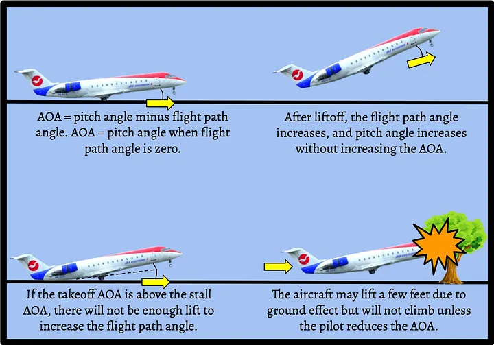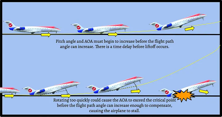 No entanto, muitas aeronaves são geometricamente limitadas, o que significa que a cauda atingirá o solo em um determinado ângulo de inclinação, limitando efetivamente o ângulo de ataque a um valor igual a esse ângulo de inclinação (já que o ângulo da trajetória de voo é zero no solo). Essas aeronaves simplesmente continuarão rolando até que a velocidade seja alta o suficiente para iniciar a decolagem no ângulo de ataque geometricamente limitado constante. Deixando esse parêntese de lado, a questão é que mesmo uma rotação apenas quatro nós antes do previsto significa que a aeronave precisará atingir um ângulo de ataque (AOA) maior antes de decolar, e a diferença entre esse AOA e o AOA crítico será menor do que se a rotação tivesse sido iniciada na velocidade correta.