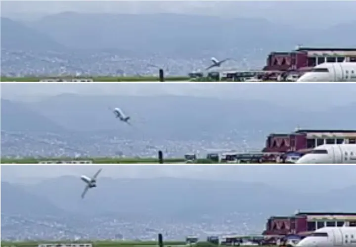 De qualquer forma, Shakya continuou a inclinar o manche para cima, aproximando-se de 15 graus, enquanto o ângulo de ataque subia acima de 10 graus, e o avião começou a estolar. Três segundos após a decolagem, a asa direita perdeu sustentação e caiu, fazendo com que o avião inclinasse para a direita em 25 graus a uma altitude muito baixa. O Capitão Shakya imediatamente moveu os comandos para a esquerda para interromper a inclinação, mas corrigiu demais, fazendo com que o avião atingisse uma inclinação vertiginosa de 55 graus para a esquerda antes de começar a rolar para o outro lado. Durante esses poucos segundos, o alerta de vibração do manche continuou vibrando e o ângulo de ataque permaneceu em torno de 10 graus.
