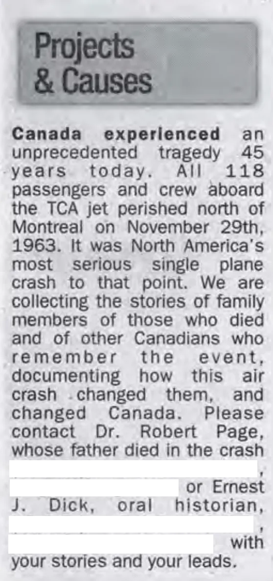 No 45º aniversário do acidente, em 29 de novembro de 2008, Bob e Ern compraram um anúncio classificado no jornal "The Globe and Mail" e imploraram às pessoas que enviassem suas histórias por telefone e/ou e-mail.