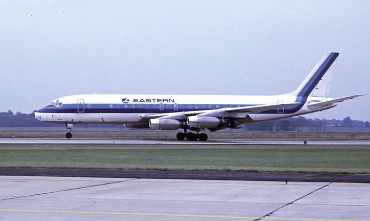 DC-8-21 da Eastern Air Lines, matrícula N8604, semelhante ao N8607, em 1967 no Aeroporto de Dulles (Fonte: Chris Kennedy)