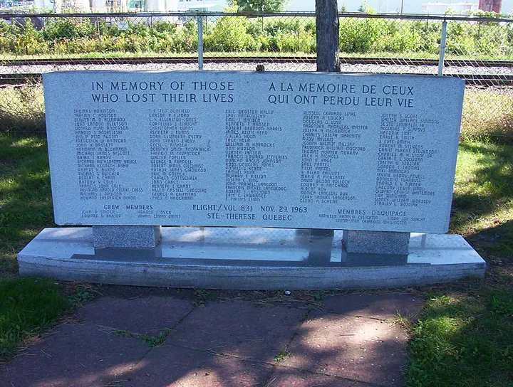 No 50º aniversário do acidente, cerca de 350 familiares das vítimas se reuniram em Blainville. O museu Joseph-Filion, na cidade vizinha de Saint-Thérèse, tinha uma exposição sobre o acidente, e ônibus foram disponibilizados para levar os familiares até o local da queda, hoje um bairro residencial chamado Des Hirondelles, até a placa comemorativa instalada no 40º aniversário no Parque das Hirondelles, e até o memorial no cemitério de Sainte-Thérèse, construído alguns anos após o acidente, com os nomes de todos os passageiros e tripulantes a bordo.
