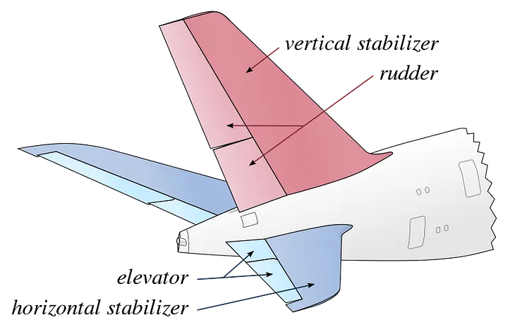 Cauda de um Airbus A380. Este é o formato padrão da cauda na maioria dos aviões de passageiros, incluindo o DC-8. Quando um avião está "trimado", todo o estabilizador horizontal se move e gira para apontar o nariz naturalmente para cima ou para baixo, sem a necessidade de os pilotos ajustarem constantemente os profundores com seus manches ou joysticks laterais (Desenho de Olivier Cleynen, licenciado sob CC BY-SA 3.0)
