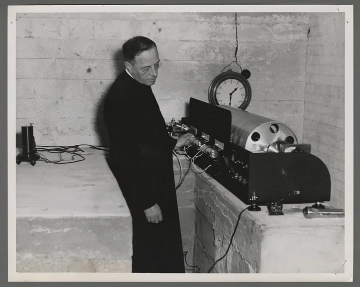 Foto de 1955 de um sismógrafo no Collège Brébeuf (Fonte: Arquivo dos Jesuítas no Canadá)